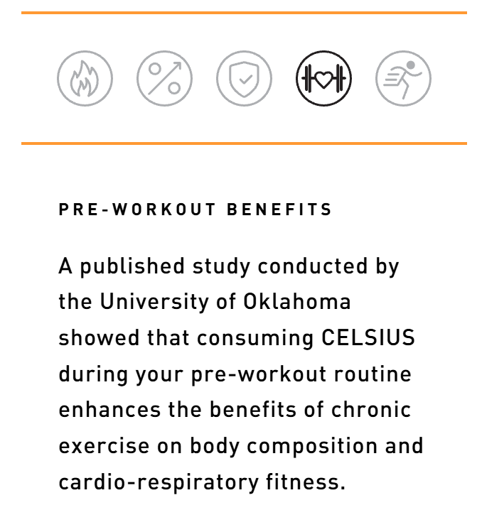 Stay active and energized all day long with CELSIUS by your side. We’re different from other energy drinks because we focus on movement. When combined with exercise, our formula is clinically proven to boost your metabolism and help you burn body fat. Whether you need an extra boost at the gym or a delicious pick-me-up to help you hustle through your workday, CELSIUS is here to help you stay active and focused on your goals. Made with only the best ingredients, CELSIUS has no artificial preservatives or flavors, no aspartame or high fructose corn syrup, and it’s very low in sodium..